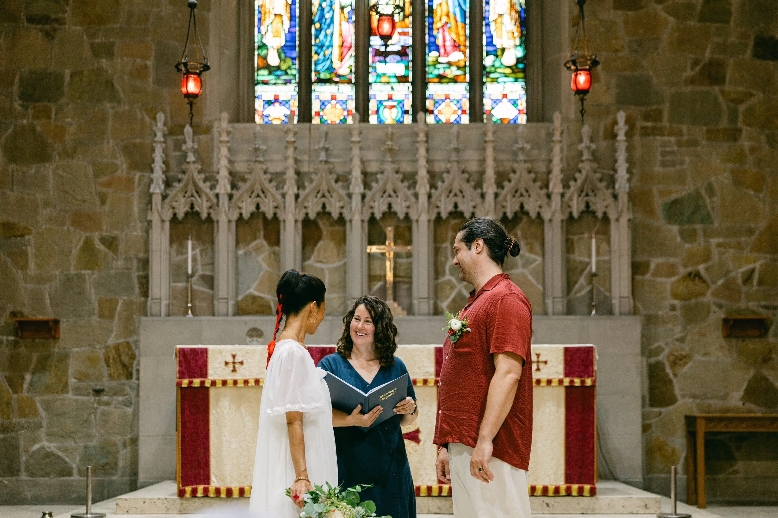 Toronto officiant, April Ellingwood, officiating an elopement ceremony in a church with stained glass windows.